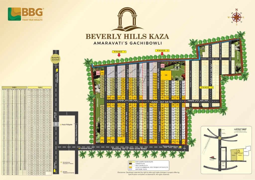 Welcome to Beverly Hills, an exclusive residential community designed for those who seek space, comfort, and a lifestyle that feels truly elevated. Spread across 40 acres in the highly sought-after location of Kaza, Mangalagiri, this prestigious project brings you 600 premium plots across Phase I and Phase II—ideal for building your dream home in a fast-growing neighbourhood.
